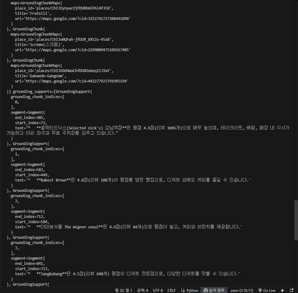아래 코드는 Google에서 제공한 공식 예제를 기반으로 작성된 간단한 테스트용 코드입니다. Gemini API를 통해 “서울 강남역 근처 디저트 카페”를 검색하고, 결과에 포함된 Google Maps 장소 정보를 함께 확인하는 과정입니다.