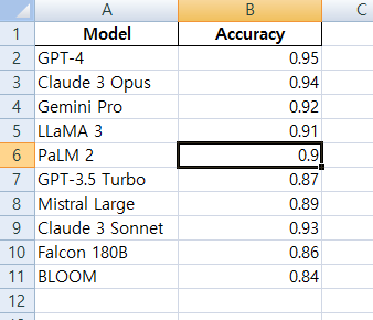 "Create an Excel (.xlsx) file with two columns: 'Model' and 'Accuracy'. "