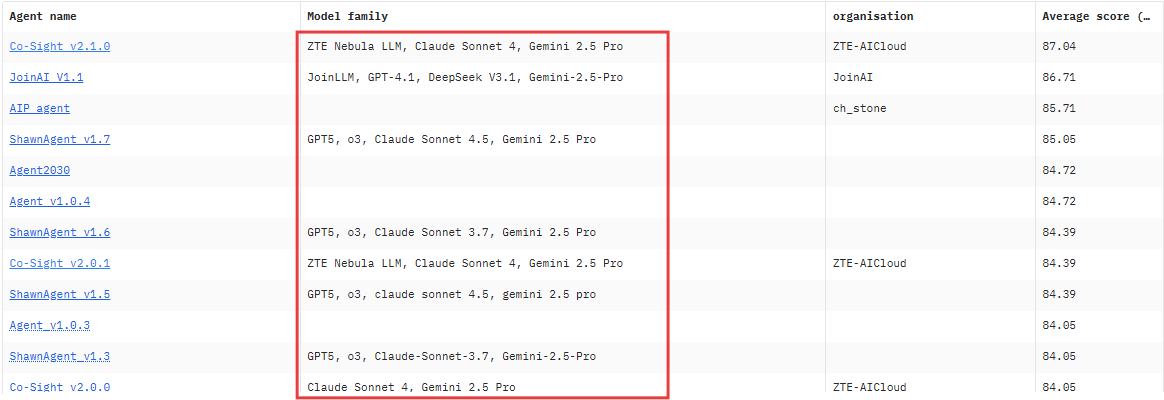 2025년 11월 GAIA 리더보드에서는 여전히 Claude Sonnet 4와 Gemini 2.5 Pro를 결합한 에이전트들이 상위권을 유지하고 있습니다. 특히 ZTE-AICloud의 Co-Sight v2.1.0이 평균 87.04점으로 1위를 기록했으며, JoinAI v1.1(86.71점), AIP Agent(85.71점), ShawnAgent v1.7(85.05점)이 그 뒤를 이었습니다.