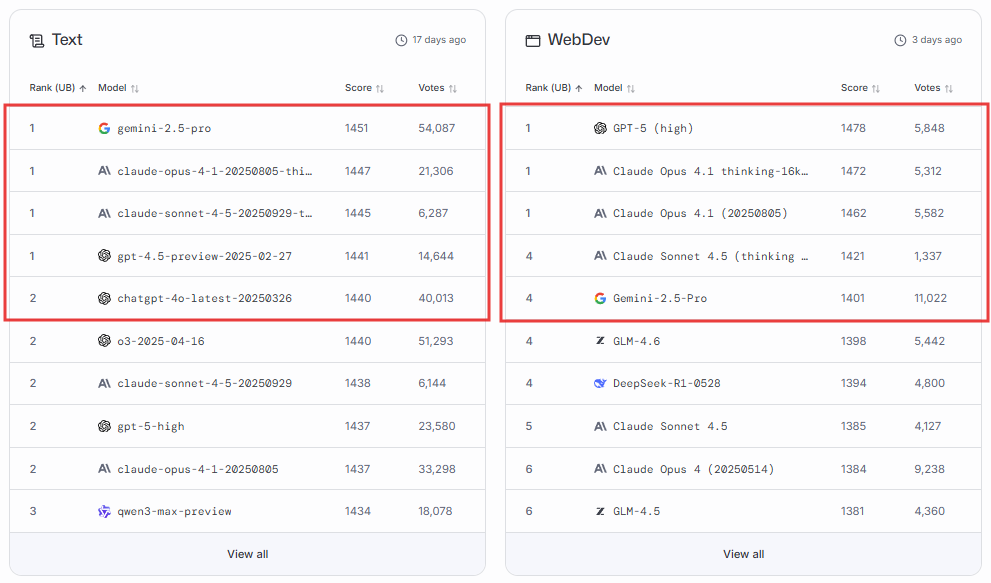 - GPT-5 (High)는 WebDev 분야에서 확실한 우위를 점하며, 개발용 AI 모델의 새로운 기준으로 자리잡고 있습니다.