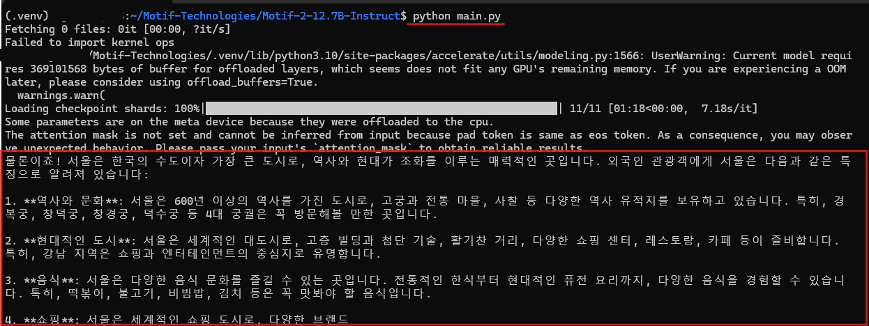 아래는 로컬 환경에서 Motif 2 모델을 직접 다운로드하고 실행하는 기본 예시입니다.