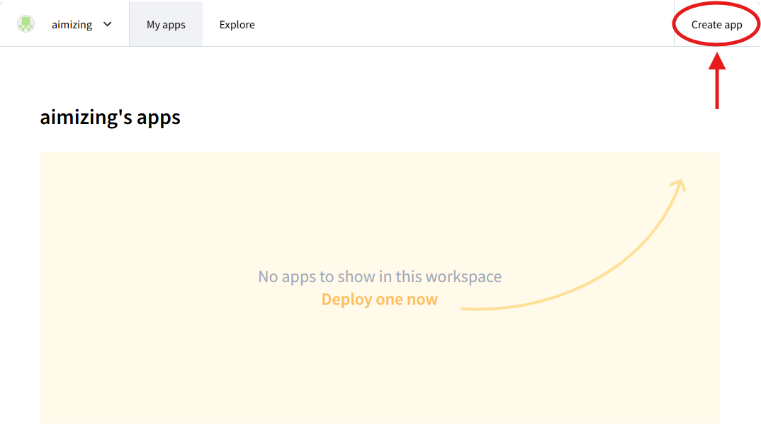 - Streamlit 공식 사이트 우측 상단 Create app 클릭