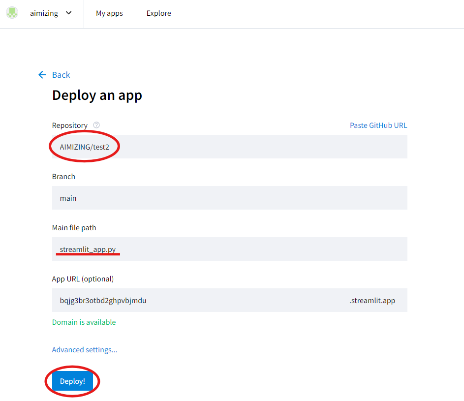 - Main file path에는 처음 작성했던 프론트엔드 코드 파일명 입력 (예를 들어, 파일명을 "streamlit_app.py"로 저장한 경우 이 파일명을 입력합니다.)