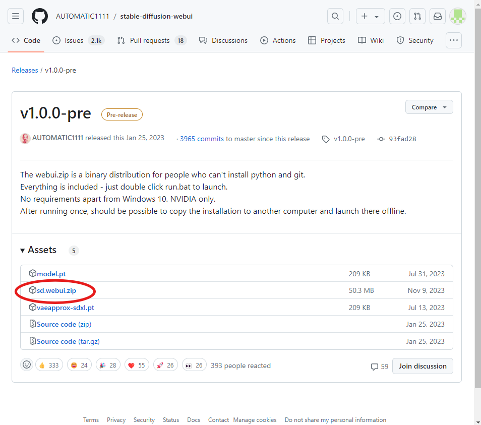 - "Installation on Windows 10/11 with NVidia-GPUs using release package" 섹션에서 v1.0.0-pre 클릭