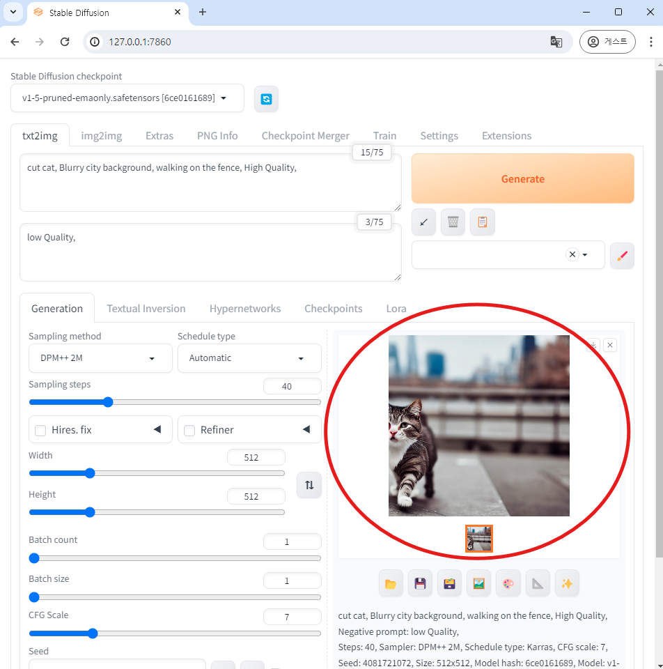 ※ "positive prompt"는 모델에게 생성할 이미지에 대해 구체적인 내용을 입력해주는 텍스트입니다. "negative prompt"는 모델에게 최대한 지양해야할 내용들을 알려주는 텍스트입니다. Stable Diffusion에 사용되는 갖가지 용어들은 다음 포스팅 글에서 자세히 다뤄보도록 하겠습니다.