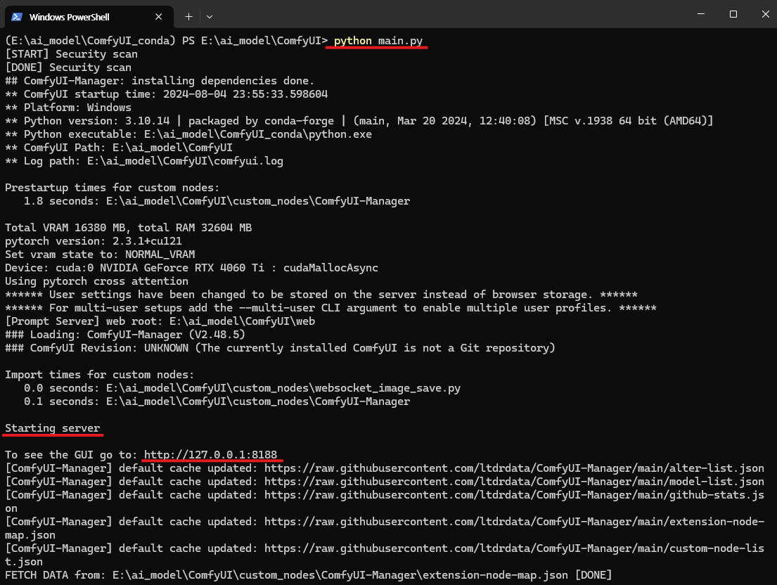 아래 명령어를 사용하여 ComfyUI를 실행합니다.