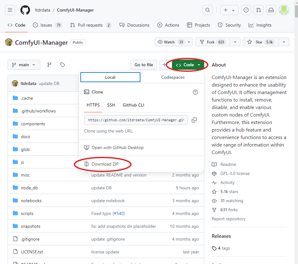 1) Github에서 ComfyUI - Manager 소스파일 다운