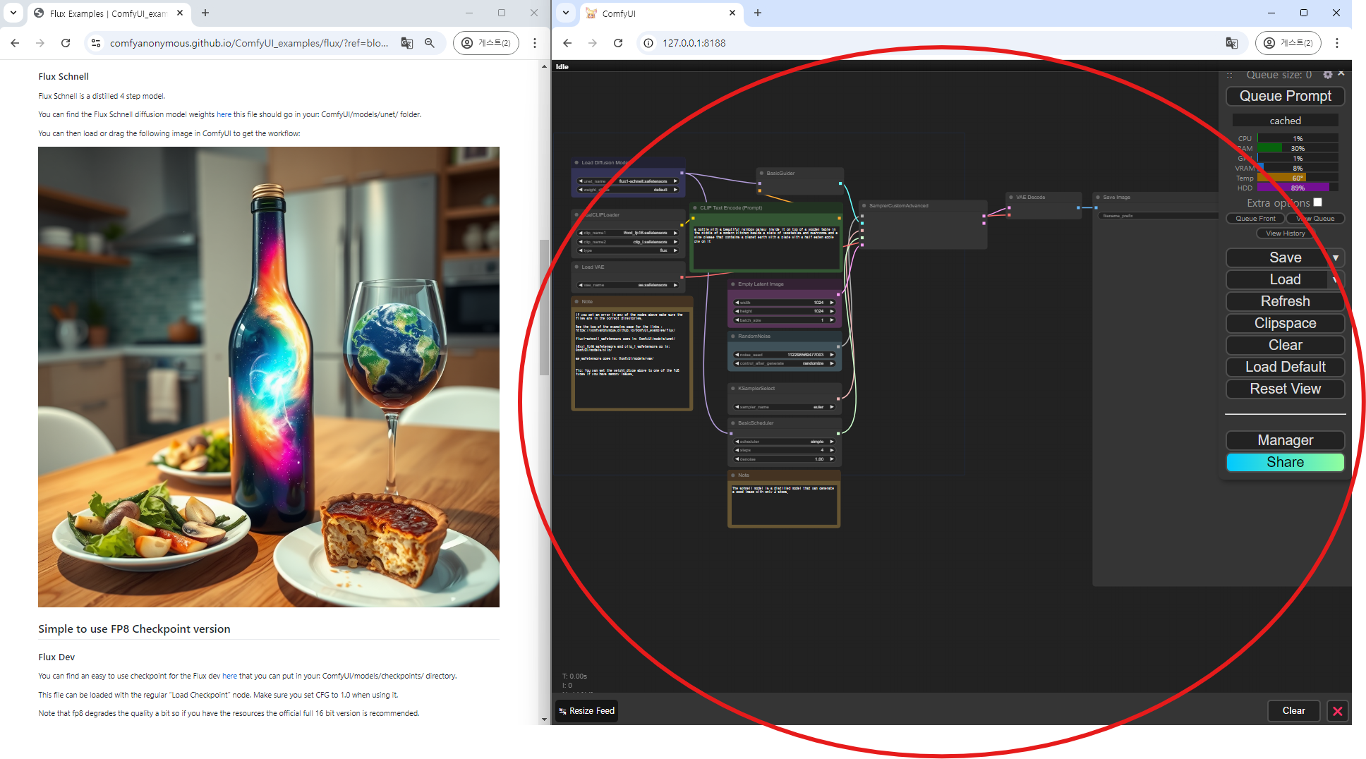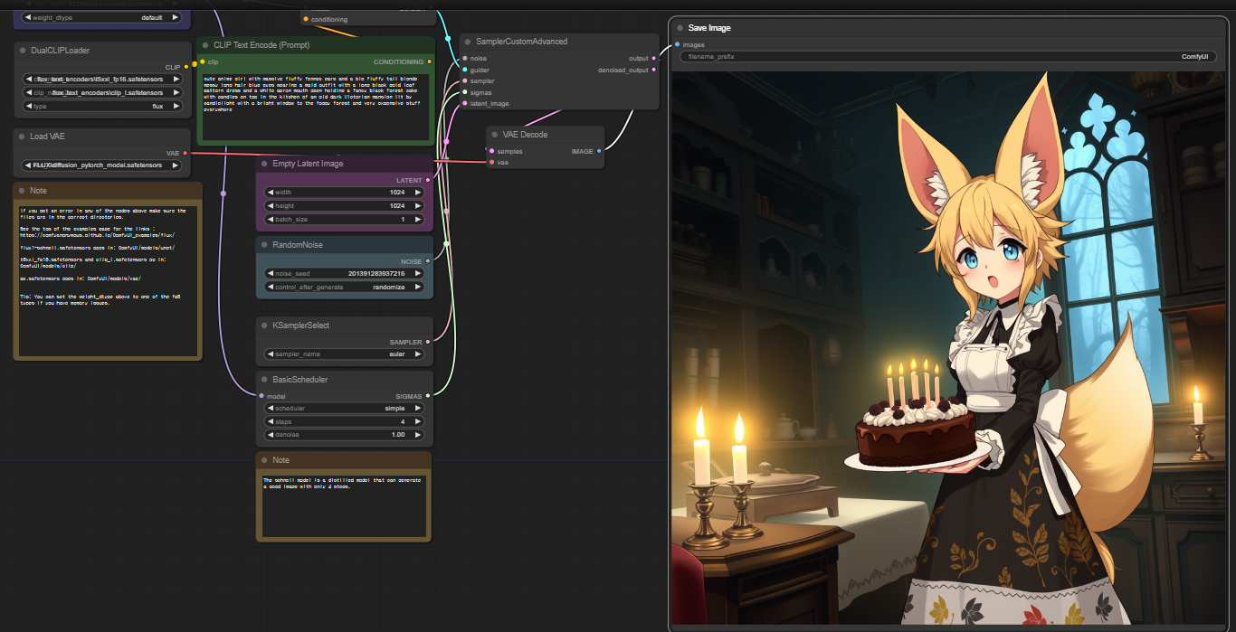 ComfyUI 예제 페이지에서는 FLUX.1-schnell 모델을 사용하기 위한 노드 구성 또한 다운로드할 수 있습니다.