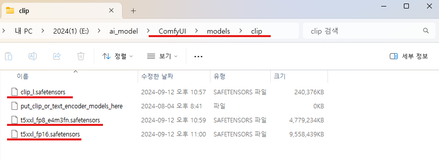 - FLUX.1 CLIP 모델 : https://huggingface.co/comfyanonymous/flux_text_encoders/tree/main