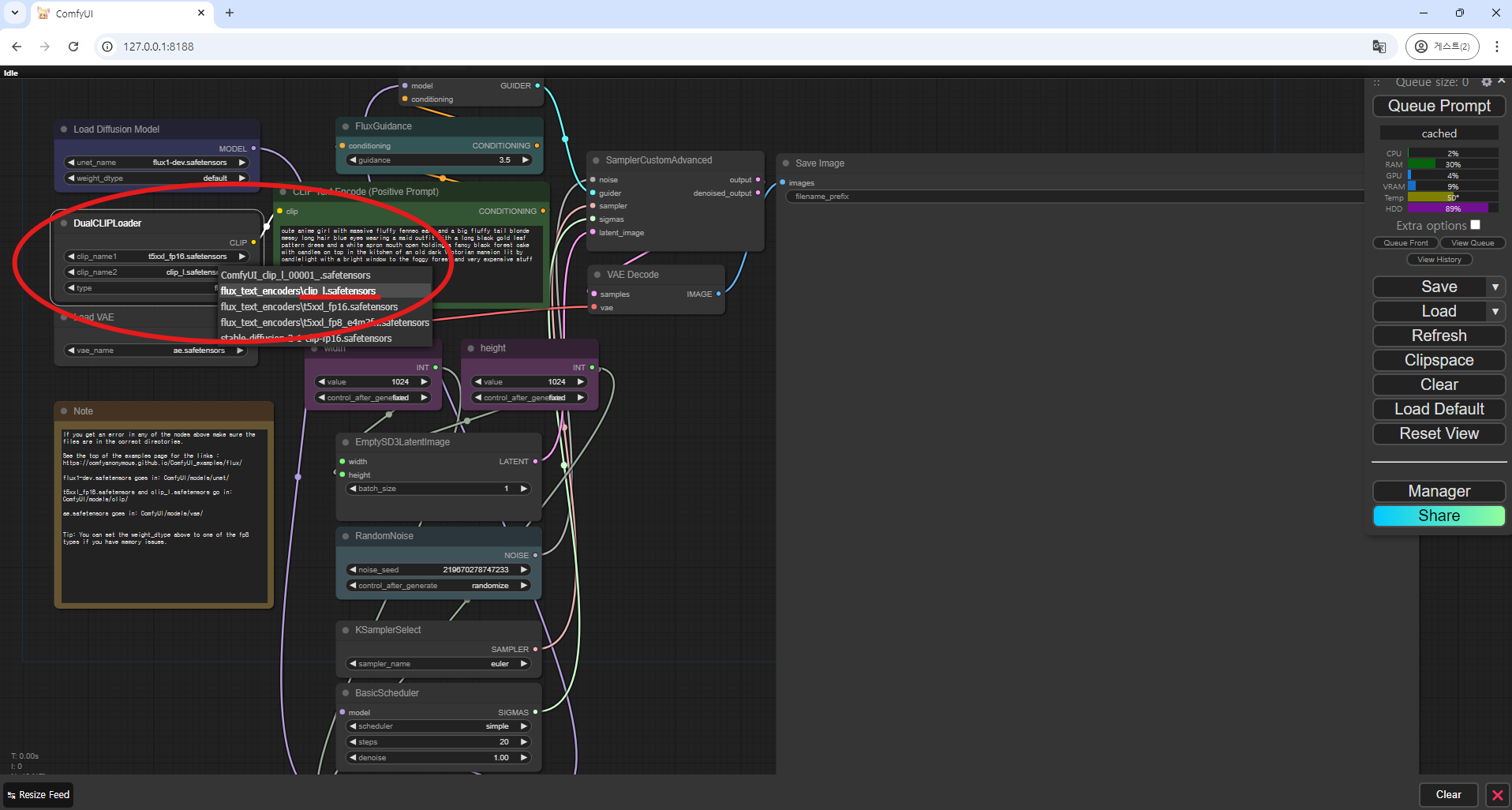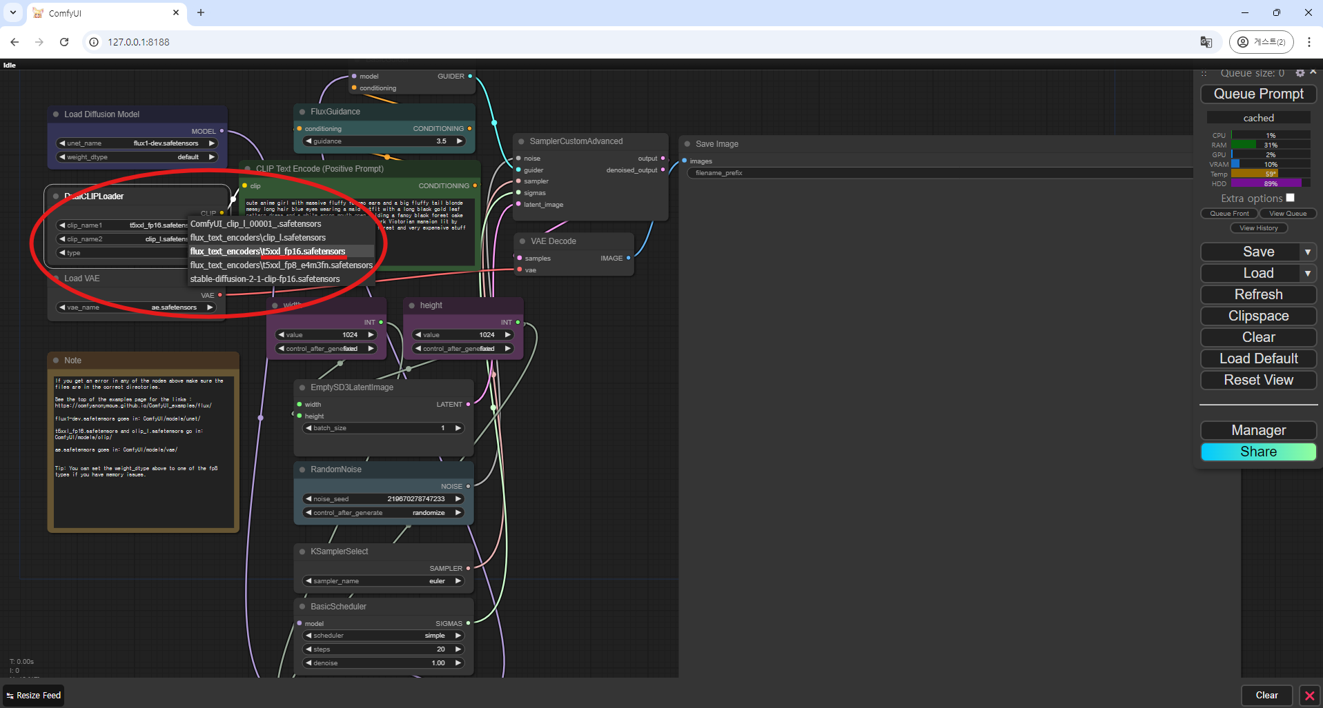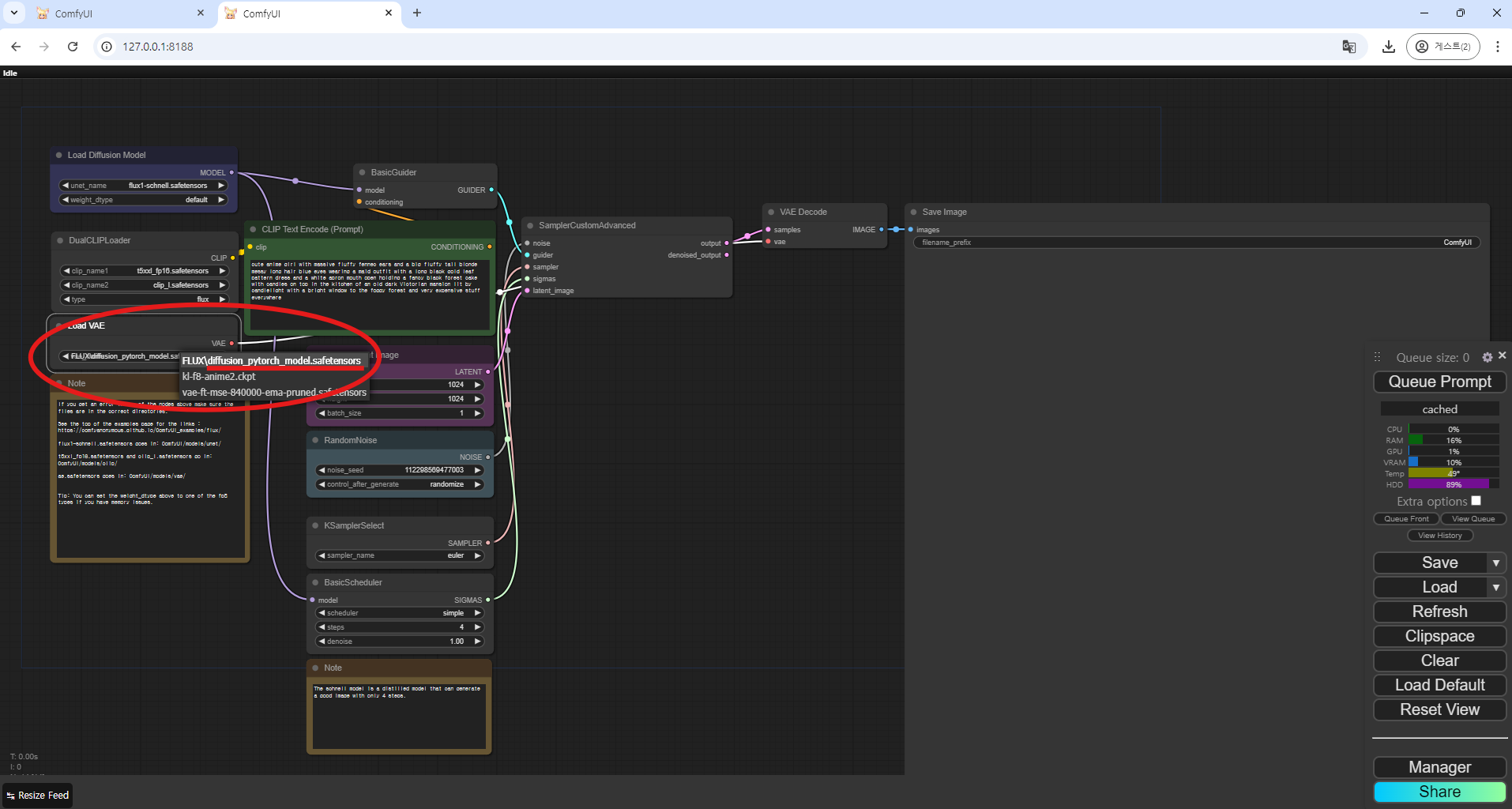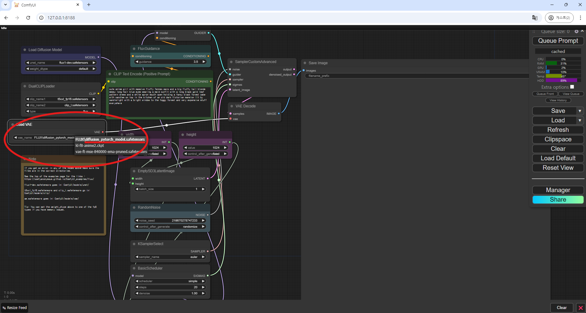 - VAE 모델 선택 : (Load VAE 노드)에서 "diffusion_pytorch_model.safetensors" 모델을 선택합니다.