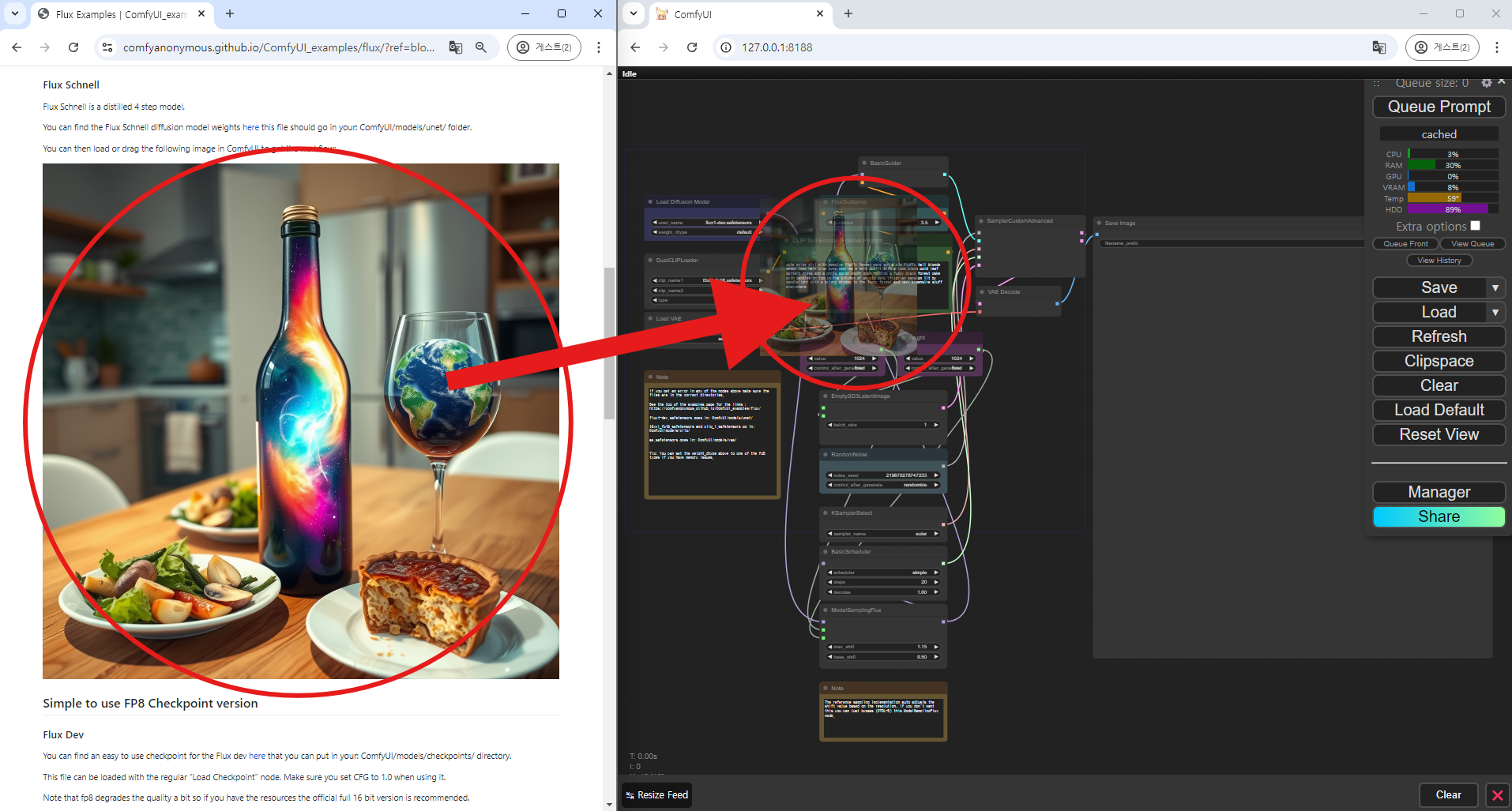 위 링크에 접속하면 Flux Dev에 대한 설명이 있습니다. 그곳에서 제공하는 이미지를 마우스 왼쪽 버튼으로 클릭한 상태에서, 현재 실행 중인 ComfyUI 창으로 드래그하면 FLUX.1-dev를 실행하기 위한 노드들이 자동으로 구성됩니다.