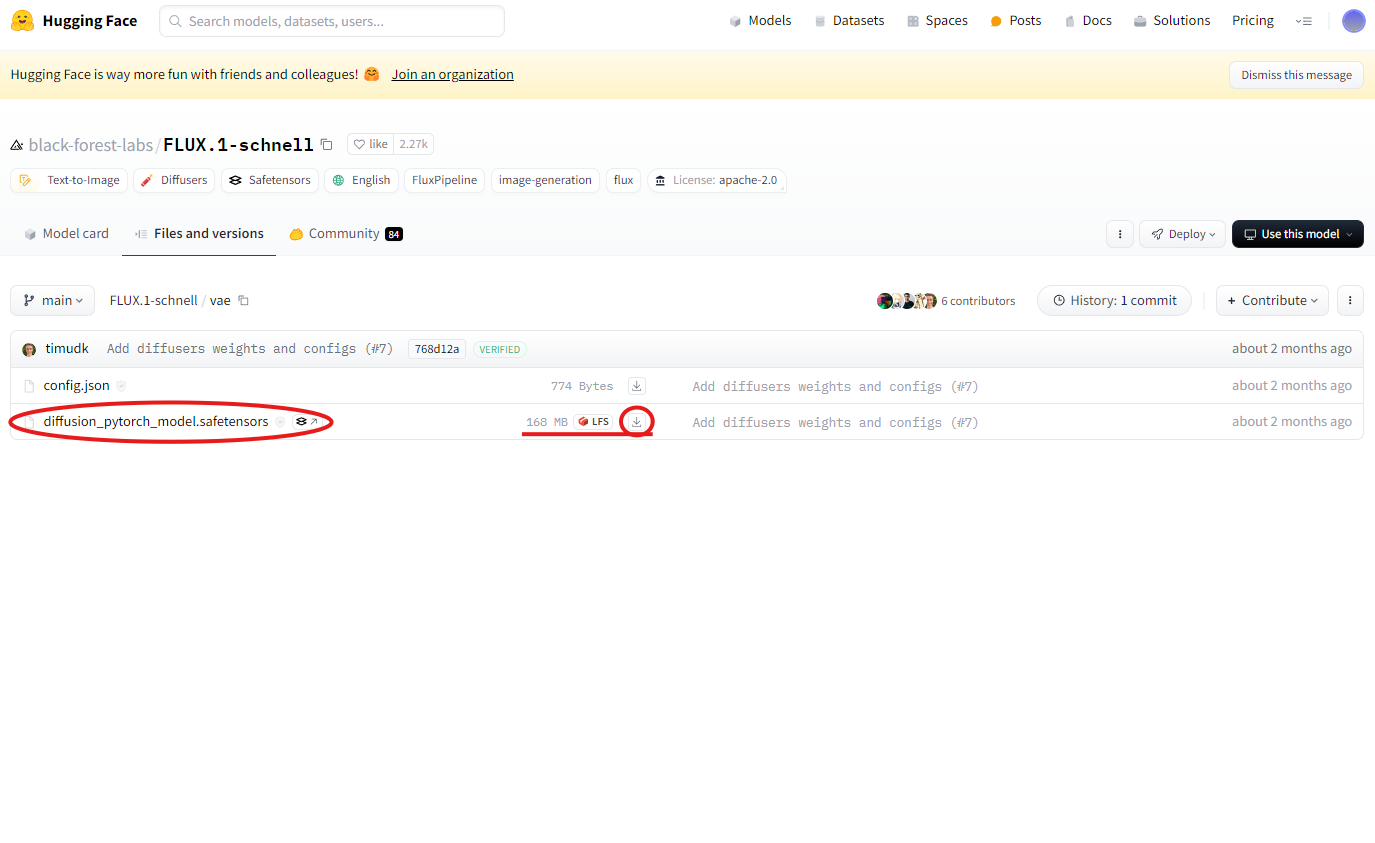 다음으로 FLUX.1 모델에 맞는 VAE 모델을 다운로드해야 합니다. VAE 모델은 앞서 방문한 Hugging Face 페이지의 VAE 폴더에 있습니다. FLUX.1-dev 모델과 FLUX.1-schnell 모델은 동일한 VAE 모델을 사용하므로, VAE는 하나만 다운로드하시면 됩니다.