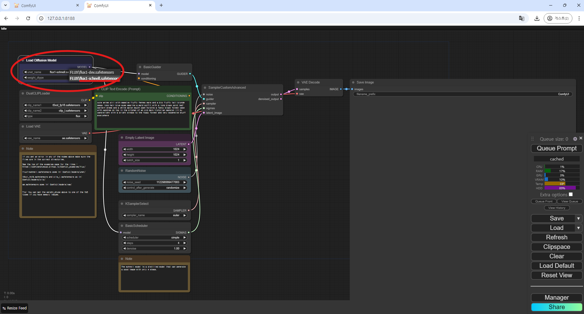 - FLUX.1-schnell 모델 선택 : (Load Diffusion Model 노드)에서 "flux1-schnell.safetensors" 모델을 선택합니다.