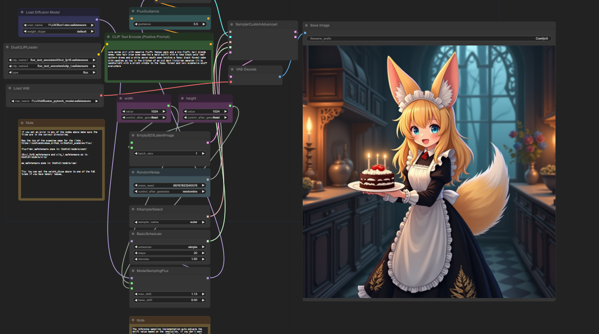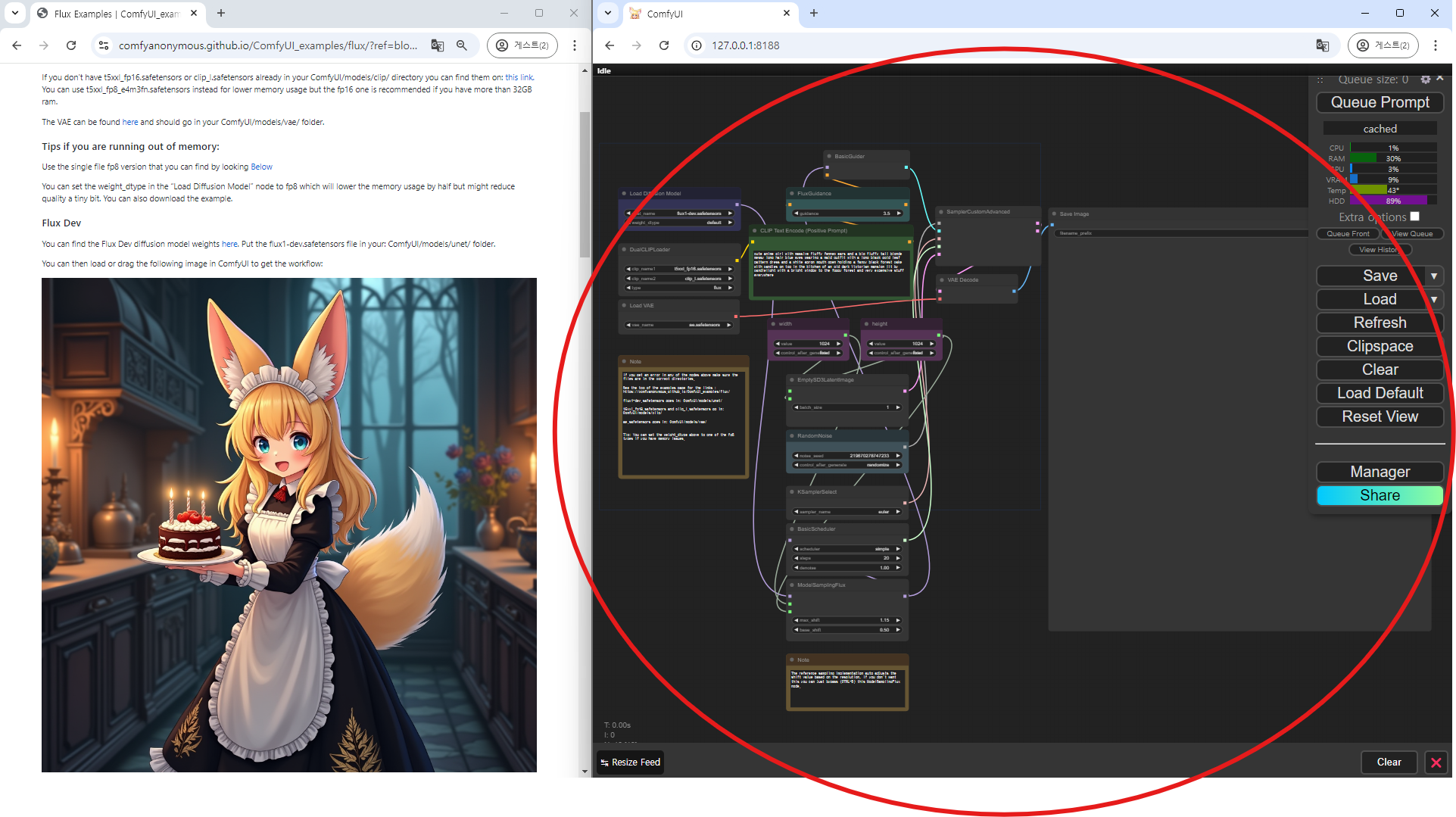 이렇게 해서 FLUX.1 AI 모델을 ComfyUI에서 사용하는 방법을 알아보았습니다. FLUX 모델을 실행하기 위해서는 생각보다 높은 사양의 PC가 필요합니다. RAM 용량이나 GPU의 성능이 중요합니다. 현재 이를 보완하기 위해 낮은 VRAM에서도 사용할 수 있는 FLUX 모델이 있다고 합니다. 그 내용은 다음 포스팅에서 다뤄보도록 하겠습니다. 궁금한 점이나 도움이 필요하시면 언제든지 댓글로 남겨주세요.