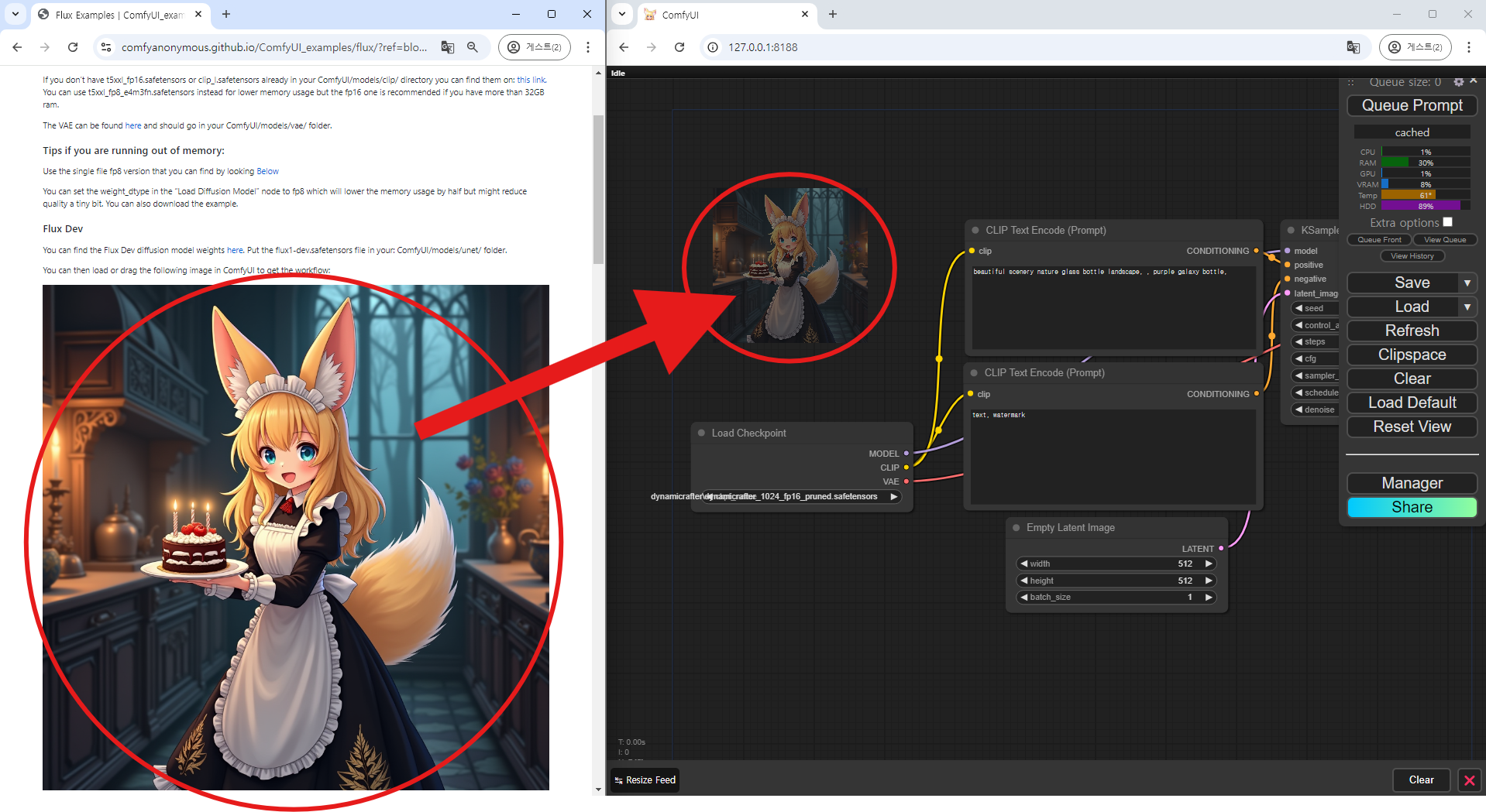 설정을 완료하셨으면 Queue Prompt 버튼을 통해 이미지 생성을 시작해줍니다.