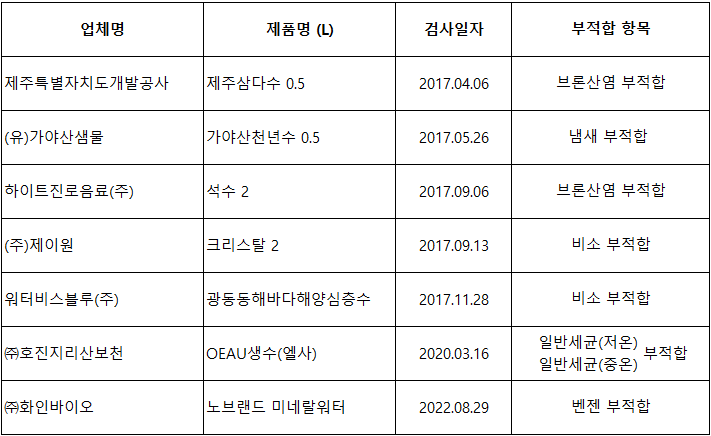 2017년 ~ 2023년까지 판매된 생수 중 수질검사 결과 부적합 판정 받은 리스트입니다.