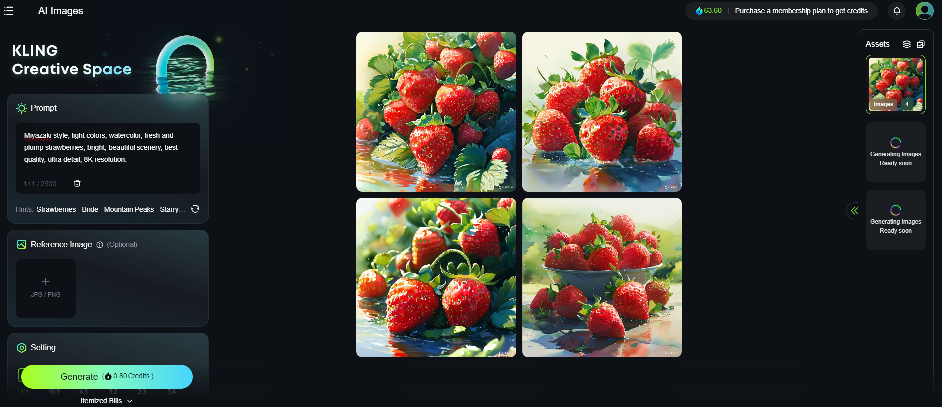 'Setting'에서는 생성할 이미지의 비율, 생성할 이미지 수 등을 조절할 수 있습니다. 생성되는 이미지 1개당 0.20 Credits이 사용되며, 이 Credits은 KLING AI에서 사용되는 코인입니다.