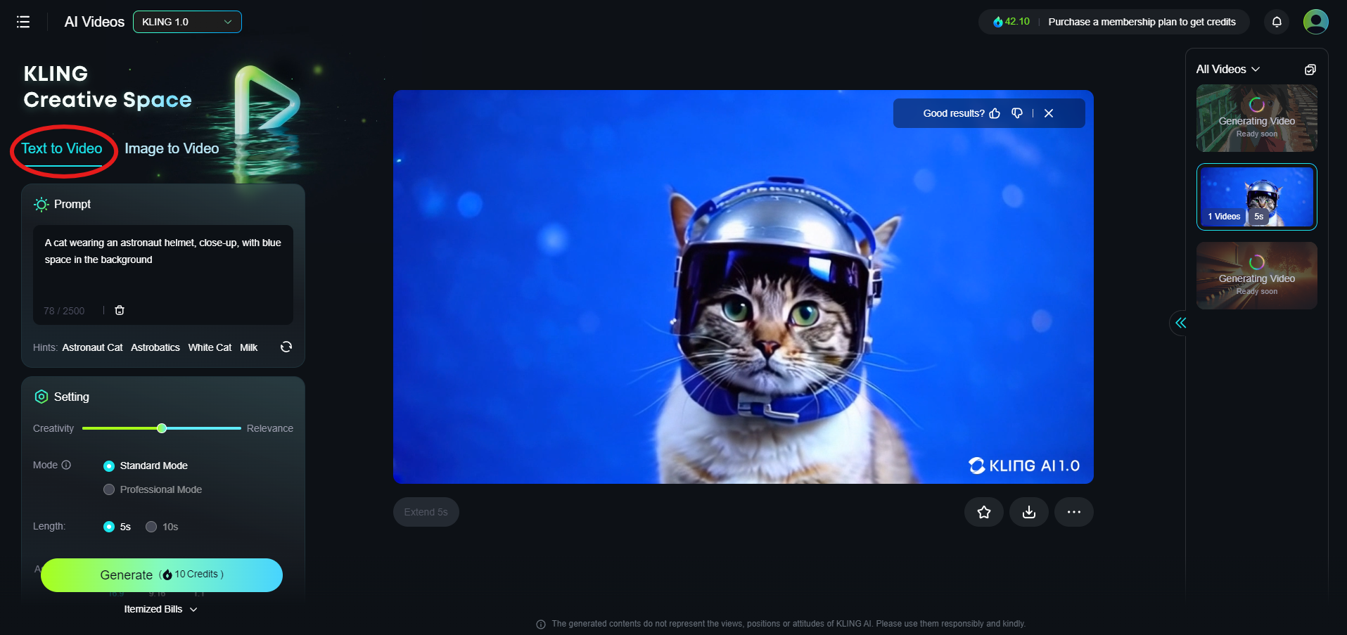 - 텍스트 to 비디오: 텍스트 입력을 통해 영상 콘텐츠를 생성할 수 있습니다. 사용자가 상상하는 장면을 텍스트로 설명하면, Kling AI가 이를 바탕으로 동영상을 제작합니다.