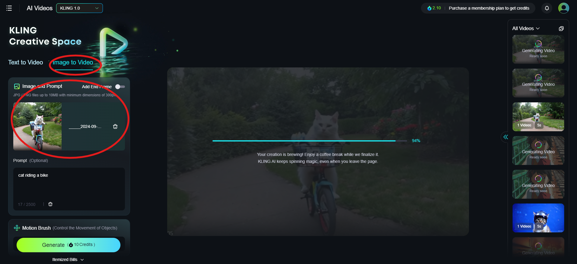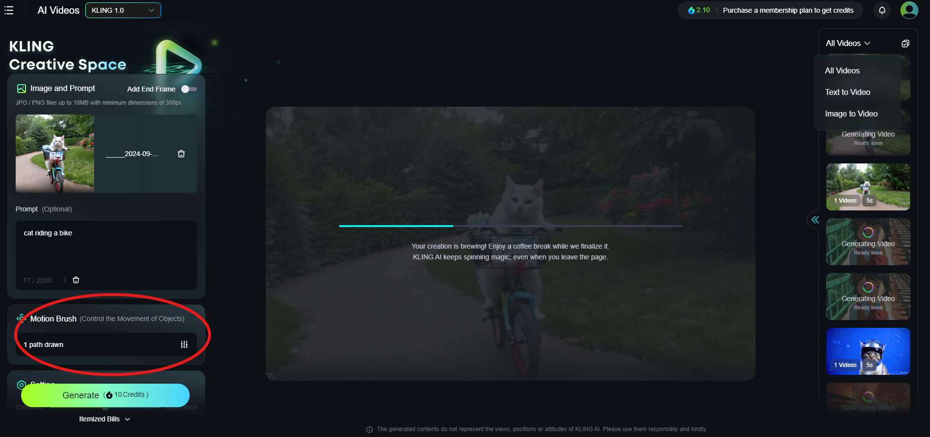 "Image to Video" 기능을 통해 이미지를 영상으로 변환할 수 있습니다. "Image and Prompt" 섹션에서는 이미지와 함께 텍스트를 입력할 수 있습니다. 특히 주목할 만한 기능은 "Motion Brush"입니다. 이 기능은 이미지에 특정 모션을 입력하면, 그 모션을 반영한 영상을 생성해 줍니다. 예를 들어, 고양이 사진을 업로드하고 고양이가 점프하는 모션을 입력하면, 고양이가 점프하는 영상을 만들 수 있습니다.