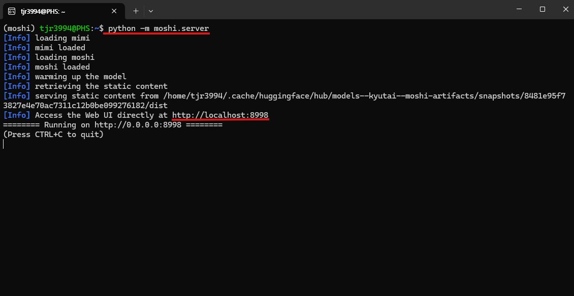 아래 명령어를 통해 Moshi를 실행할 수 있습니다. 처음 실행 시 Moshi 모델을 다운로드하고 설정하는 과정이 있어 시간이 다소 소요될 수 있습니다. 이 점 참고해 주세요.