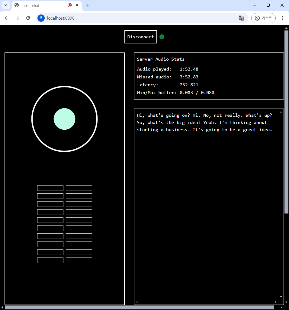 위 이미지는 Moshi가 정상적으로 실행된 화면입니다. Moshi는 사용자의 목소리를 인식하여 음성으로 답변하고, 텍스트 답변도 함께 제공합니다. 다만, 현재 사용 중인 하드웨어 사양이 부족하여 즉각적인 응답은 들을 수 없었습니다.
