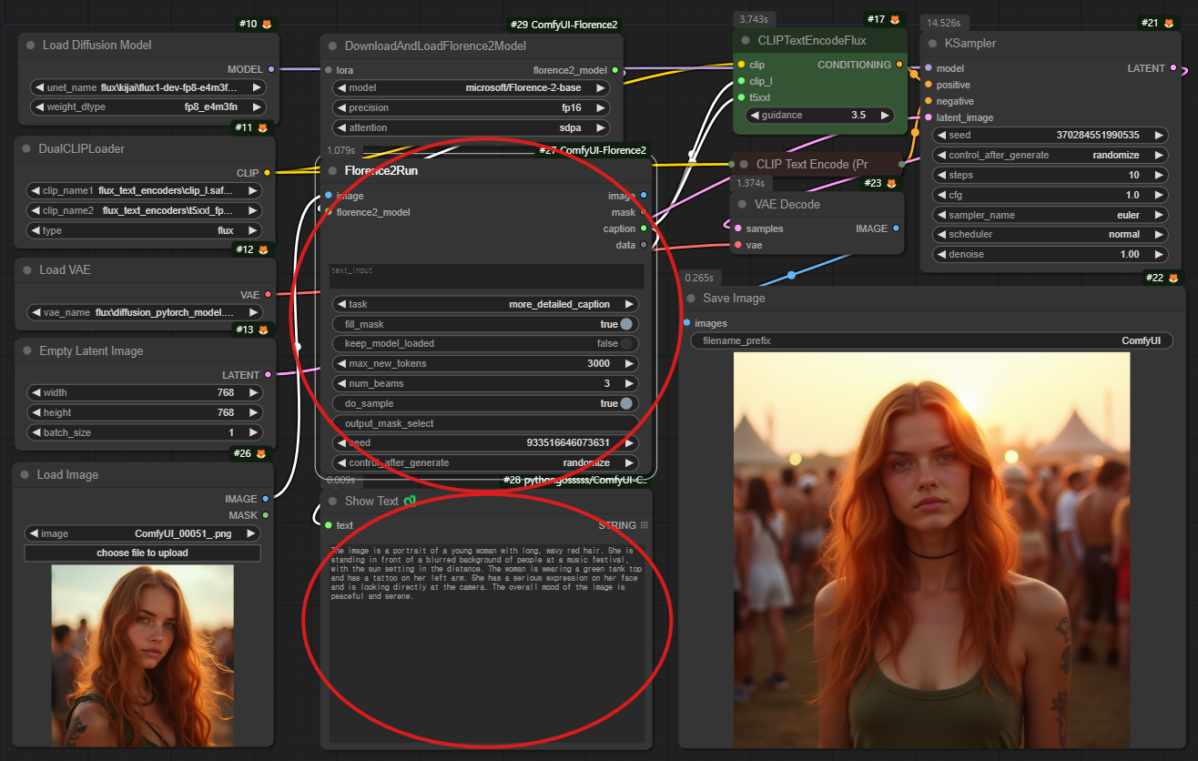 - 사용 예시: 사용자가 특정 이미지의 분위기와 구도를 유지하면서 새로운 요소를 추가하고 싶을 때, Florence2를 사용해 원본 이미지의 특징을 프롬프트로 추출할 수 있습니다. 이렇게 추출된 프롬프트를 통해 원본 이미지의 감성을 유지하면서도 새로운 창작을 할 수 있습니다.