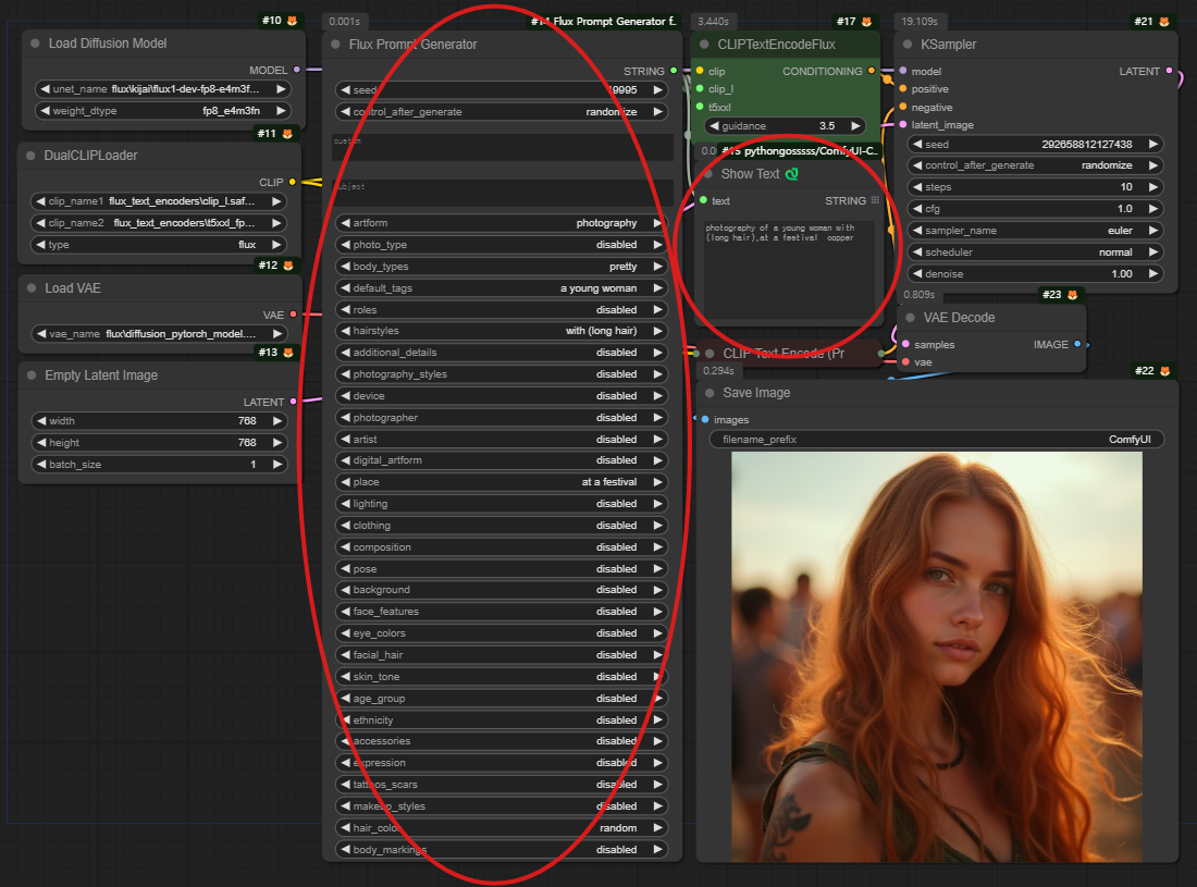 Flux Prompt Generator는 사용자가 직접 프롬프트를 작성하지 않고 간단한 옵션 선택만으로 자동으로 프롬프트를 생성할 수 있는 편리한 노드입니다. 이 노드는 다양한 설정을 기반으로 사용자가 원하는 스타일이나 테마에 맞는 프롬프트를 쉽게 생성하도록 도와줍니다. 사용자는 감성, 색감, 혹은 특정 스타일을 선택하면 이에 맞는 최적의 프롬프트가 자동으로 생성되어 이미지 생성에 사용됩니다.