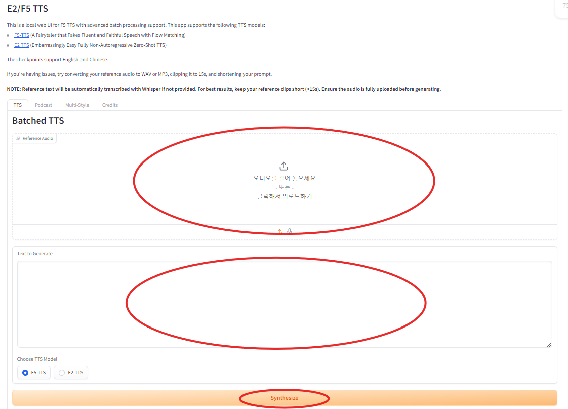 인터페이스 상단에는 복사할 음성을 업로드할 수 있는 부분이 있습니다. 사용자는 음성 파일을 업로드하거나 마이크를 통해 직접 목소리를 업로드할 수도 있습니다. 가운데에는 텍스트를 입력하는 부분이 있으며, 입력한 텍스트를 선택한 음성이 말하게 됩니다. "Synthesize" 버튼을 클릭하면, 선택한 음성이 입력된 텍스트를 말하는 음성 파일을 생성할 수 있습니다. 또한, 화면 하단 좌측에 F5-TTS와 E2-TTS 두 개의 버튼이 있는데, 이는 각각 다른 목소리 모델을 나타냅니다. 개인적으로 사용해본 결과, F5-TTS 모델의 성능이 좀 더 우수한 것으로 보입니다.