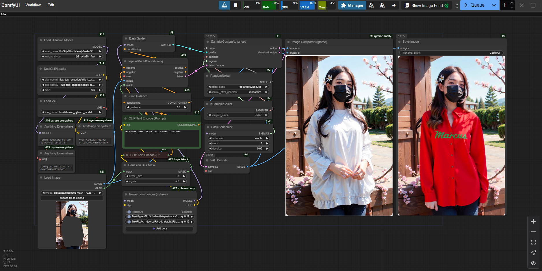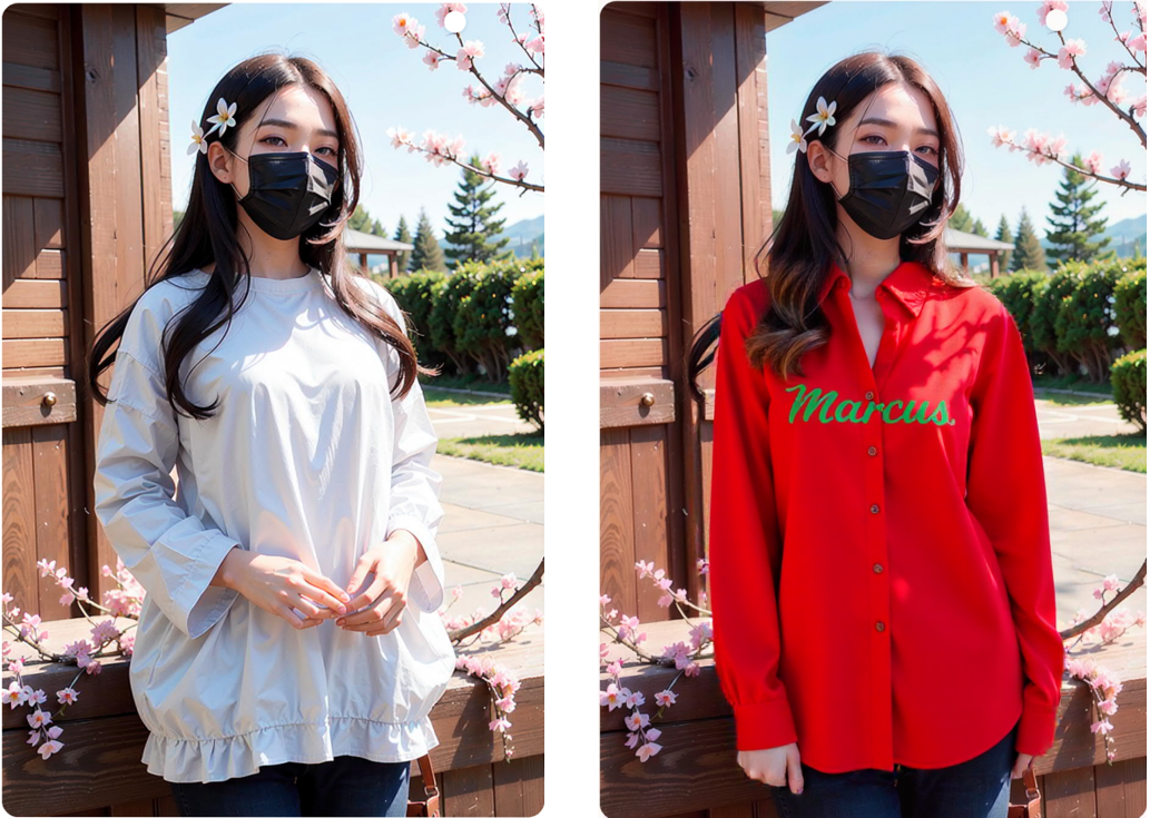 위와 같이 노드를 구성하고 샘플 이미지를 사용하여 Inpainting을 진행하였습니다. 이때 사용한 프롬프트는 "red blouse, green 'Marcus' text printed, front view"입니다. 기존에 있던 옷의 색상을 빨간색 블라우스로 변경하고, 'Marcus'라는 녹색 텍스트를 전면에 인쇄하는 것을 목표로 했습니다. 이러한 프롬프트는 모델이 색상과 텍스트 배치에 대한 명확한 정보를 제공받아 이를 기반으로 이미지의 수정된 영역을 자연스럽게 생성하게 합니다.