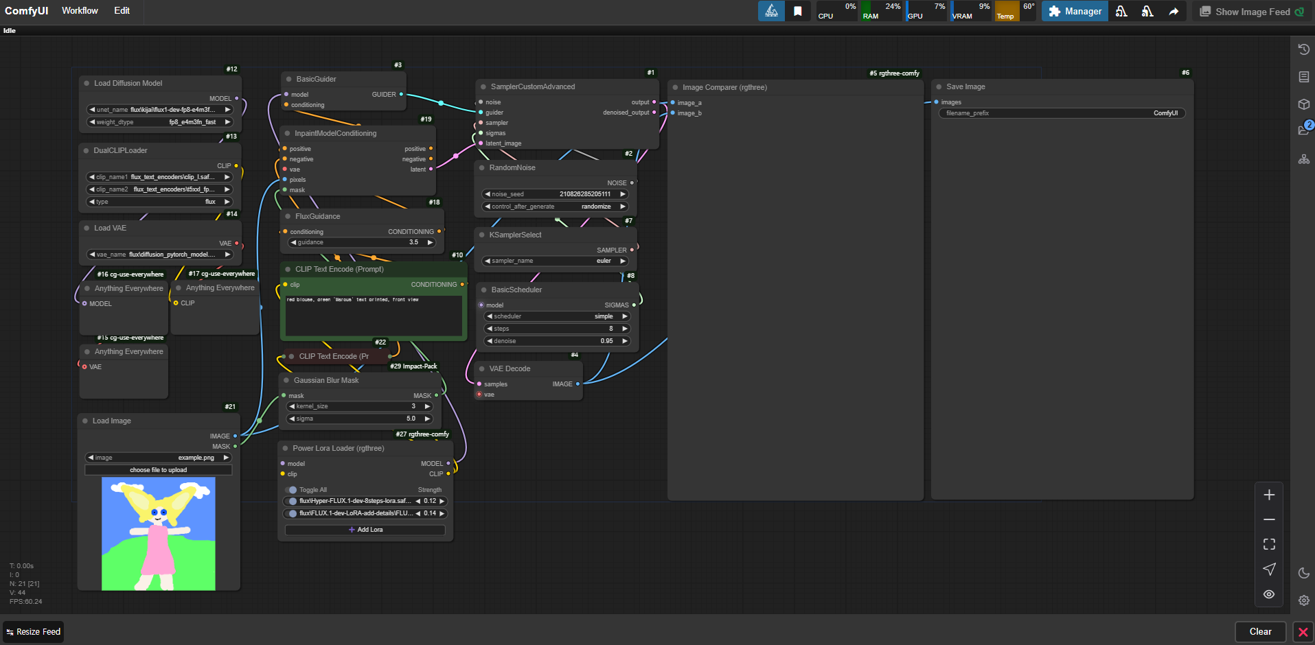 마지막으로, VAE Decode는 잠재 공간에서 이미지를 복구하고, Image Comparer를 통해 원본 이미지와 생성된 이미지를 비교해 결과를 확인합니다. 이러한 노드들의 조합을 통해 텍스트와 마스크 정보를 반영한 이미지를 점진적으로 생성하는 구조를 구성하고 있습니다.