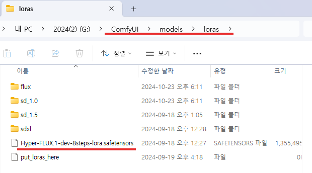 4) Hyper flux 8tep lora 모델 다운로드 및 위치 설정 (선택사항)
