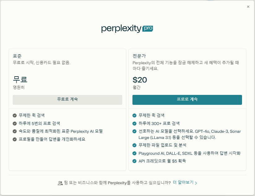 - 확장된 검색 기능: 일일 Pro 검색횟수가 무제한 가능하고, 프로는 좀 더 심층적이고 포괄적인 검색 결과를 제공합니다.