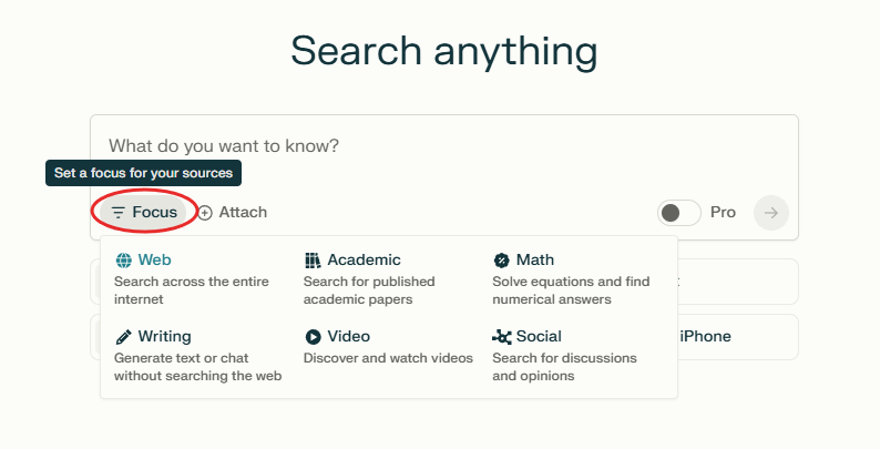 Perplexity AI는 여러 가지 검색 모드를 제공합니다. 메인 프롬프트 창 아래에서 다양한 기능을 선택하여 검색을 진행할 수 있습니다. 각 모드는 특정한 용도에 맞춰 최적화되어 있습니다.