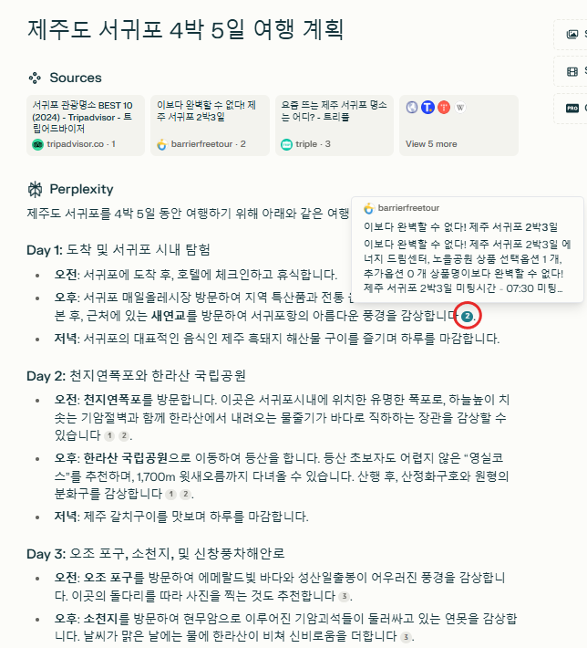 예를 들어 "제주도 서귀포 4박 5일 여행 계획"을 입력하면, 여행 계획에 관한 상세한 답변을 얻을 수 있습니다. 또한, 검색 결과에는 답변뿐만 아니라 관련 자료의 출처도 함께 제공되며, '더 보기' 옵션(아래 이미지 빨간색 표시)을 통해 출처를 확인하고 교차 검증할 수 있습니다. 이는 사용자가 정보를 신뢰할 수 있도록 돕는 중요한 기능입니다.