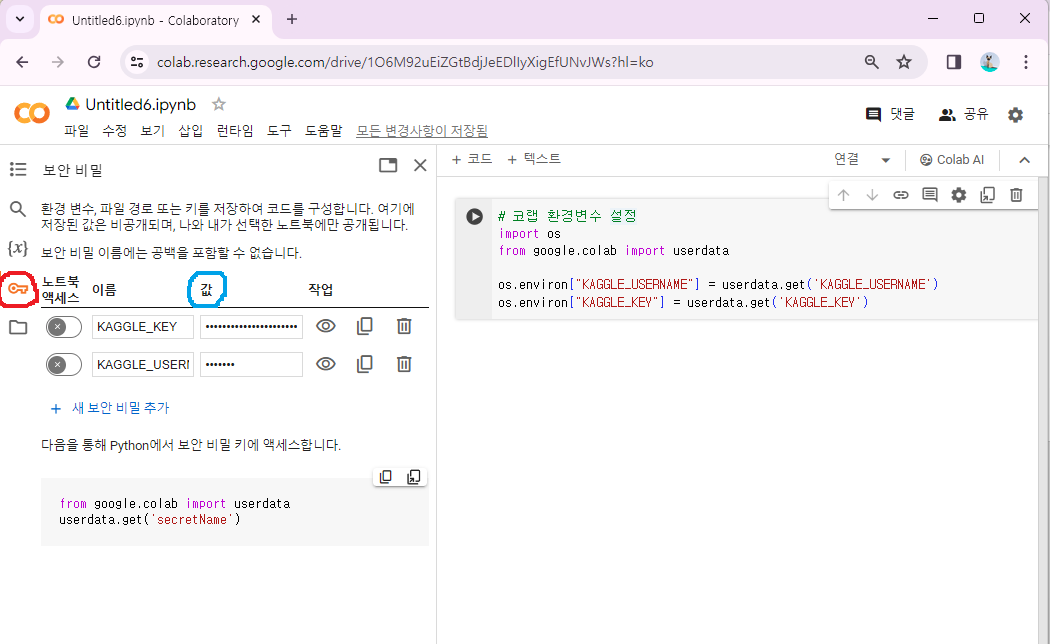 코랩 노트 왼쪽 열쇠 모양 버튼(빨간색 원) 클릭 -> 값(파란색 원)에 "kaggle.json" 파일에서 확인한 username과 key 입력