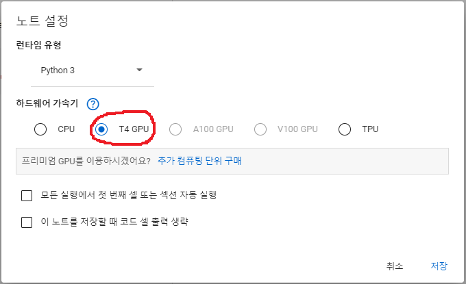 무료로 이용할 수 있는 GPU 버전인 T4 GPU를 선택합니다. 설정 방법은 수정 -> 노트설정 -> T4 GPU 선택 후 저장해주 시면 됩니다.