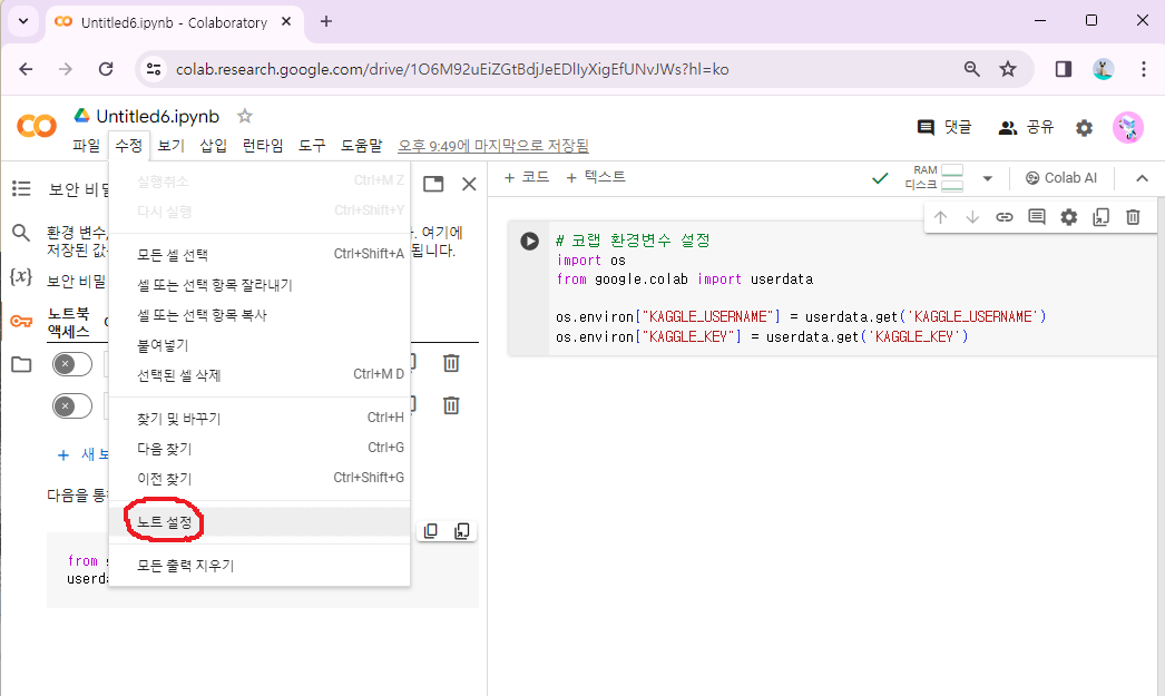 3) 코랩 환경변수 설정