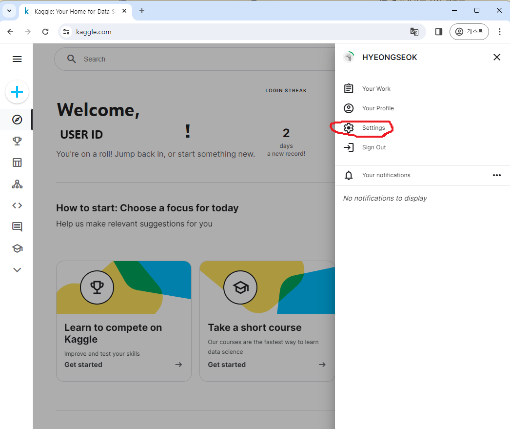2) 우측 상단 프로필 사진 클릭 (왼쪽 사진 빨간색 원) -> Settings 클릭 (오른쪽 사진 빨간색 원)