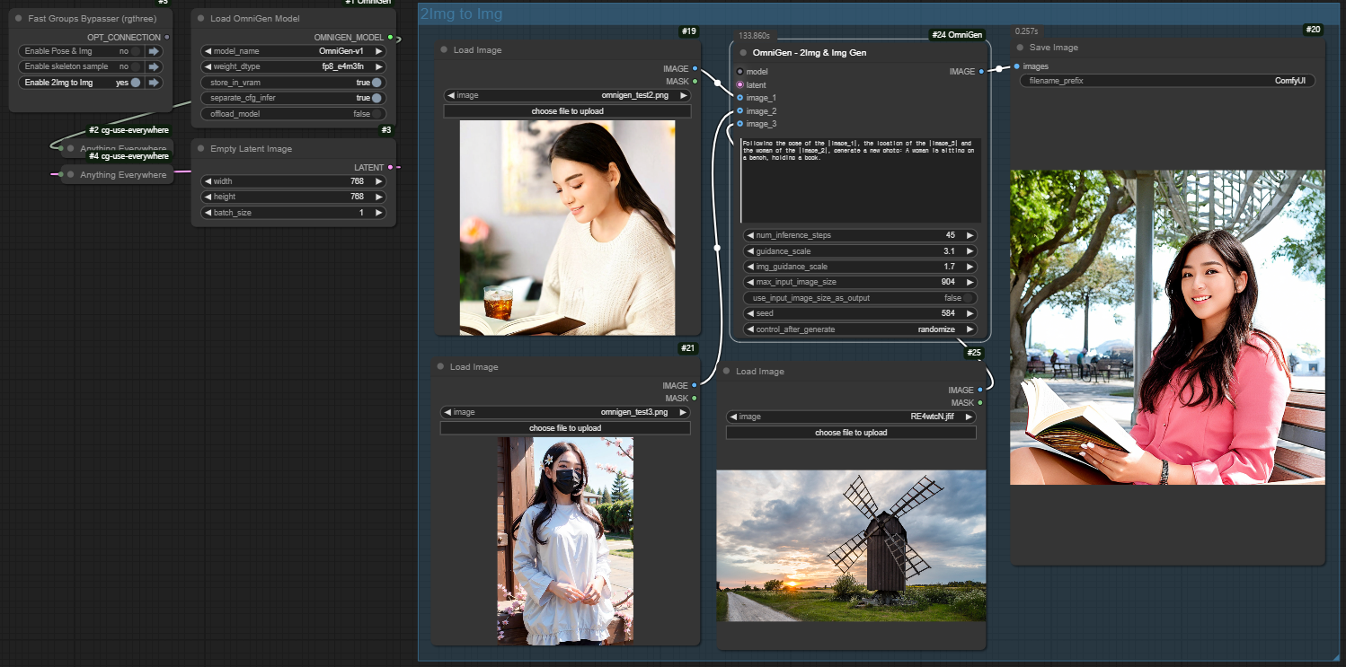 하나의 이미지에서 인물 정보를 가져오고, 다른 이미지에서 배경 정보를 추출하여 새로운 이미지를 생성하는 것도 가능합니다. 노드 구성은 동일하며, 텍스트 프롬프트를 적절히 조정하기만 하면 됩니다.