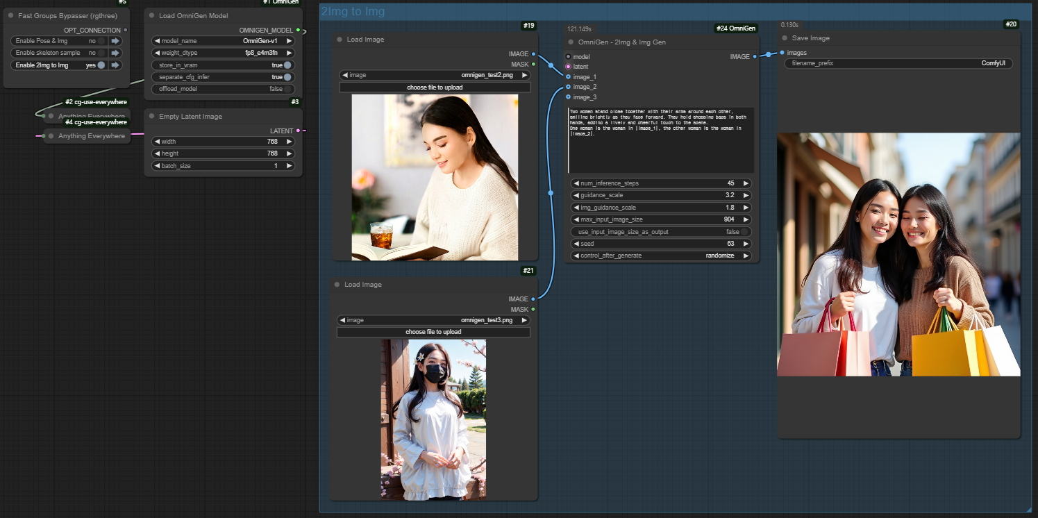 위 노드 구성은 두 장의 이미지를 결합해 새로운 이미지를 생성하는 과정으로 이루어져 있습니다. 먼저 Load Image 노드를 사용해 기준이 되는 이미지와 추가적인 스타일이나 요소를 반영할 이미지를 업로드합니다. 이후 Load OmniGen Model 노드를 통해 OmniGen 모델을 로드하고, Empty Latent Image 노드에서 생성될 이미지의 크기와 관련 설정을 정의합니다. OmniGen - 2Img & Img Gen 노드는 두 이미지를 활용해 포즈와 스타일을 결합한 새로운 이미지를 생성하며, 최종 결과물은 Save Image 노드를 통해 저장됩니다. 이 과정으로 두 이미지를 기반으로 창의적인 결과물을 만들어낼 수 있습니다.